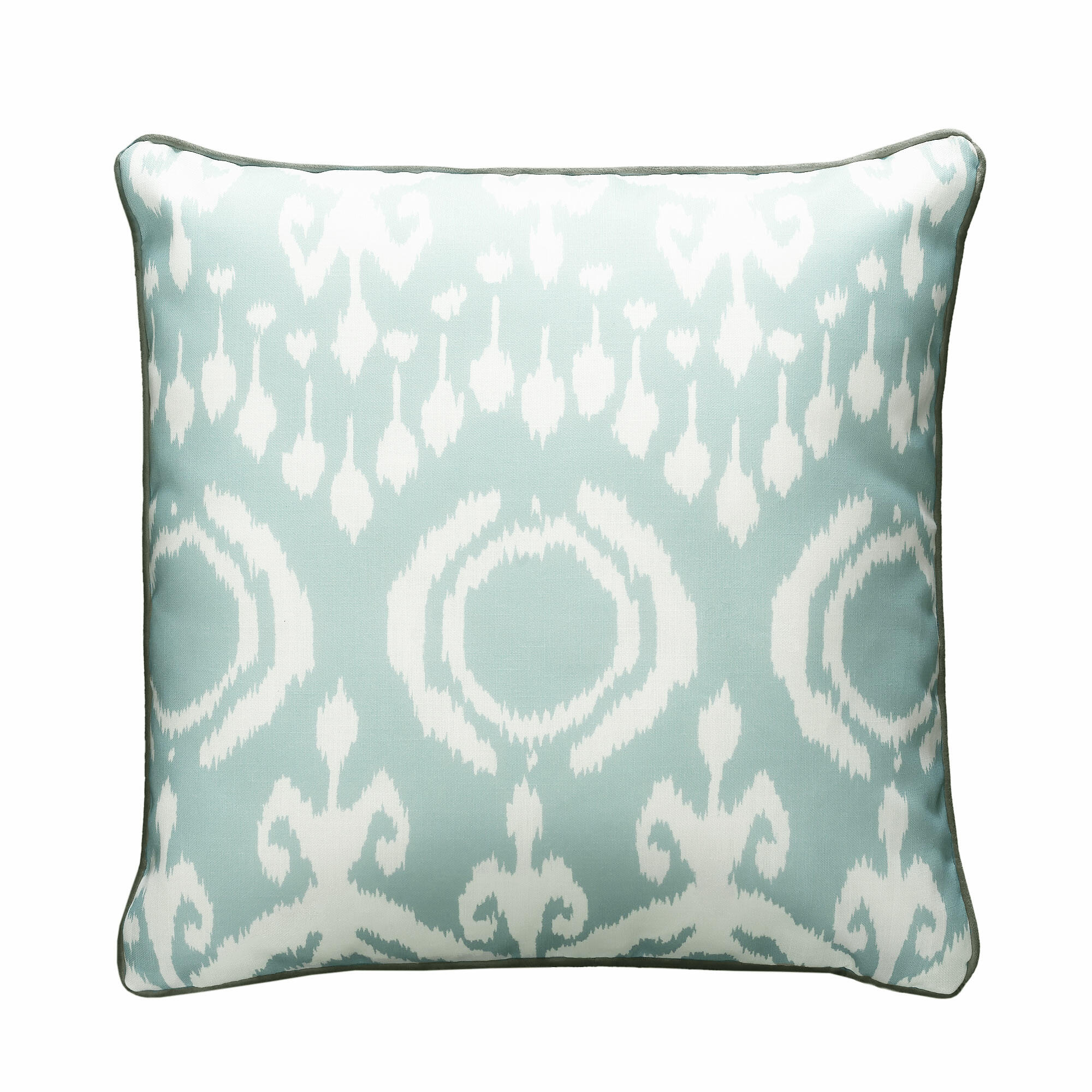 Bold and eye-catching, outdoor cushion inspired by the traditional ikat prints of Indonesia. In a soft blue colour, the rounded shapes and flowing lines are relaxed and organic. Finished with a grey velvet piping this cushion feels smart and contemporary, perfect for turning your outdoor space into a cosy and comfortable living area.